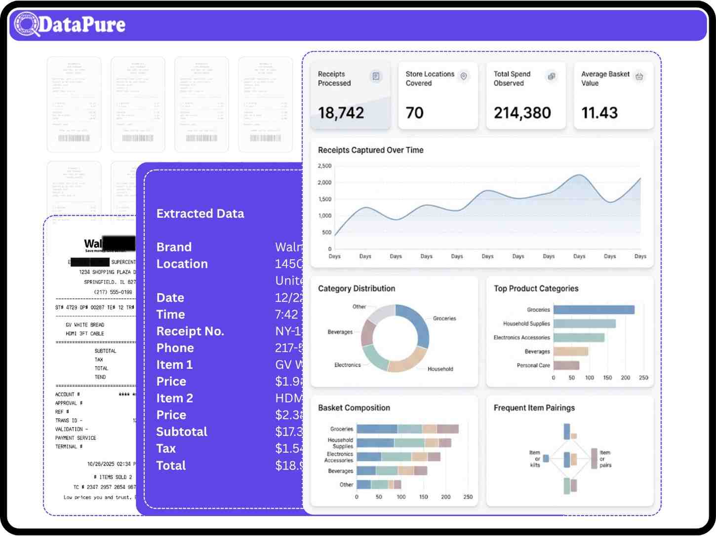 DataPure’s AI transforms simple receipt photos into clean, structured, and fully traceable data. By minimizing manual review and standardizing data extraction across thousands of receipts, teams get consistent, comparable insights they can trust; unlocking faster, deeper visibility into pricing, assortment, shopper behavior, and competitive trends.